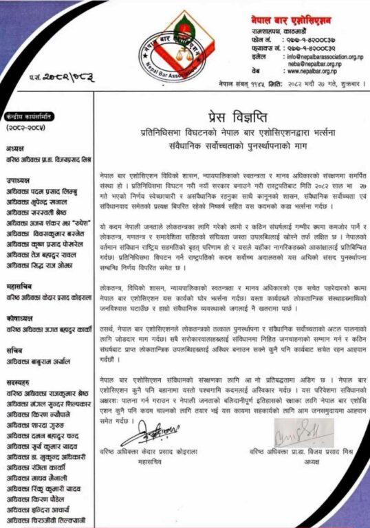 सबै सरोकारवालाहरुलाई संविधानमा निहित जनचाहनाको सम्मान गर्न र कठिन संघर्षबाट प्राप्त लोकतान्त्रिक उपलब्धिहरुलाई अस्थिर बनाउन सक्ने कुनै पनि कार्यबाट सचेत रहन आह्वान गरेको छ ।संविधानको संरक्षणका लागि आफनो प्रतिबद्धतामा अडिग रहेको बताउँदै कुनै पनि बहानामा यस्तो पश्चगामि कदमलाई अस्विकार गर्ने एसोसिएसनले जनाएको छ ।विज्ञप्तिमा भनिएको छ,‘यस परिवेशमा संविधानको अक्षरशः पालना गर्न गराउन र नेपाली जनताको बलिदानीपूर्ण इतिहासको रक्षाका लागि नेपाल बार एशोसि एशन कुनै पनि कदम चाल्नको लागि तयार भई यस कायमा सहकार्यको लागि आम जनसमुदायमा आहवान समेत गर्दछ ।