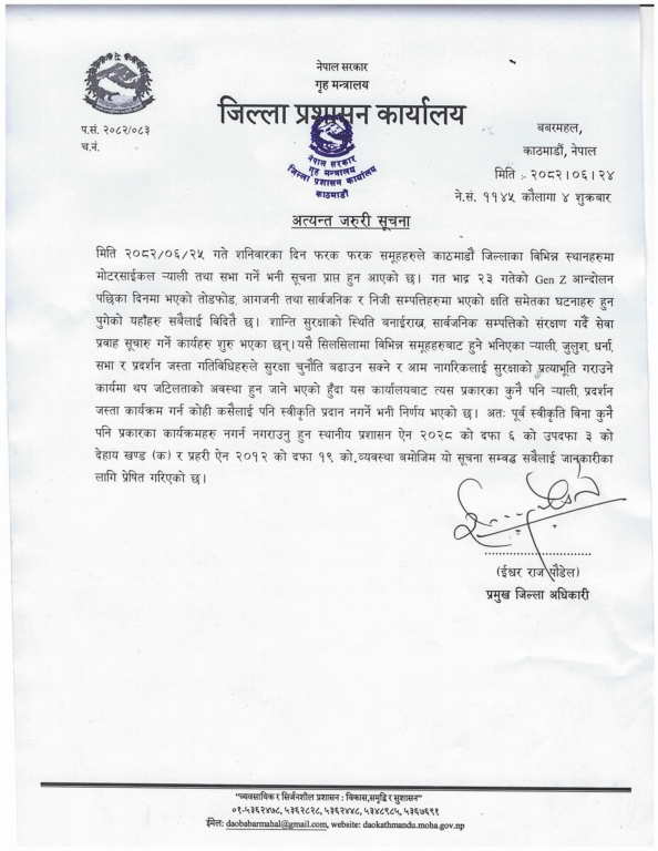 युवा संघले शनिबार काठमाडौंमा मोटरसाइकल र्‍यालीको आयोजना गर्ने घोषणा गरेको थियो । तर काठमाडौंका प्रमुख जिल्ला अधिकारी ईश्वरराज पौडेलले कुनै पनि समूह वा संगठनलाई र्‍याली, जुलुश र सभा जस्ता कार्यक्रम गर्न अनुमति नदिइएको जनाएका हुन् ।