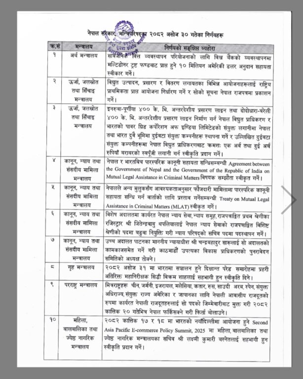 काठमाडौं । मन्त्रिपरिषद्ले गरेका निर्णयहरु सार्वजनिक भएका छन्।
