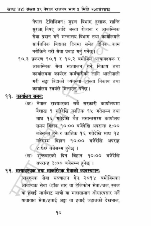 कात्तिक १६ गतेदेखि माघ १५ गतेसम्म कार्यालय समय बिहान १० बजेदेखि दिउँसो ४ बजेसम्म तोकिएको छ । अन्य समयमा भने बेलुकी ५ बजेसम्म कार्यालय समय रहँदै आएको छ ।