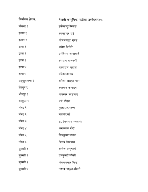 काठमाडौं । नेपाली कम्युनिष्ट पार्टीले देशभरका उम्मेदवारहरू टुंगो लगाएको छ । आगामी फागुन २१ गते हुने प्रतिनिधिसभाको निर्वाचनका लागि नेकपाले प्रत्यक्षतर्फका उम्मेदवार टुंग्याएको हो ।
