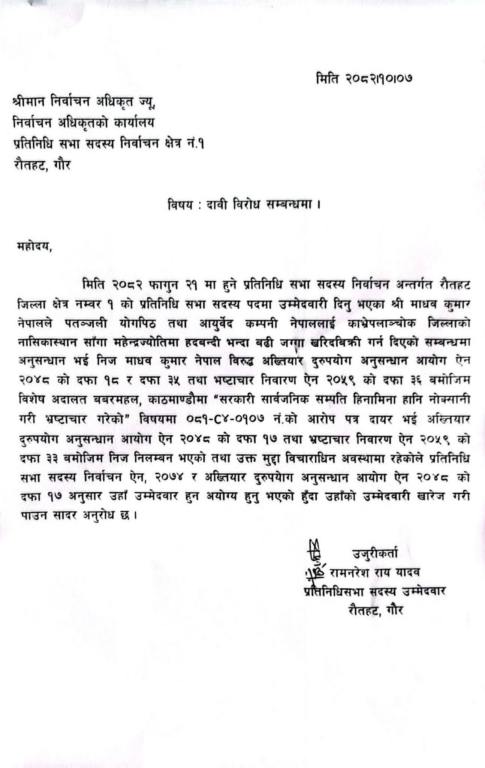 पतञ्जलि जग्गा प्रकरणमा मुछिएका नेपाल उम्मेदवार बन्न अयोग्य रहेको उजुरीमा उल्लेख छ।