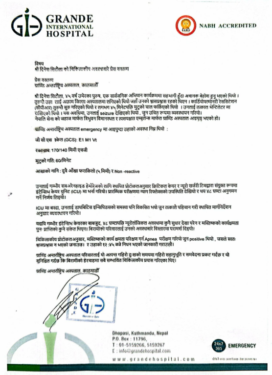 ग्राण्डी अस्पतालको भेन्टिलेटरमा राखेर उपचार भइरहेकोमा चिकित्सकले आज १२ः४५ बजे मृत घोषणा गरेका हुन् । उनको आजै पशुपति आर्यघाटमा दाहसंस्कार गर्ने तयारी छ ।