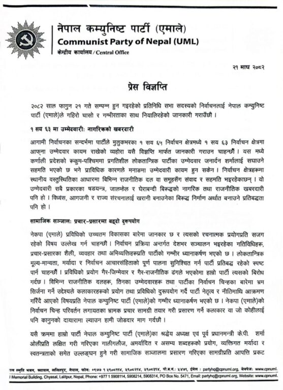 प्रचार विभाग प्रमुख एवं आम चुनावका पार्टी प्रेस संयोजक मीनबहादुर शाहीको हस्ताक्षरमा जारी विज्ञप्तिमा भनिएको छ, ‘प्रविधिको प्रयोग गैर-जिम्मेवार र गैर-राजनीतिक ढङ्गले भएकोमा हाम्रो पार्टी त्यसको विरोध गर्दछ । विभिन्न राजनीतिक दलहरू, तिनका उम्मेदवारहरू तथा पार्टीका निर्वाचन चिन्हका बारेमा भ्रम सिर्जना गर्ने उद्देश्यले कलाकारहरूको प्रयोग तथा प्रविधिको दुरुपयोग गर्दै पार्टी नेतृत्व र नीतिमाथि आक्रमण गरिँदै आएको विषयप्रति नेपाल कम्युनिस्ट पार्टी (एमाले) को गम्भीर ध्यानाकर्षण भएको छ ।’