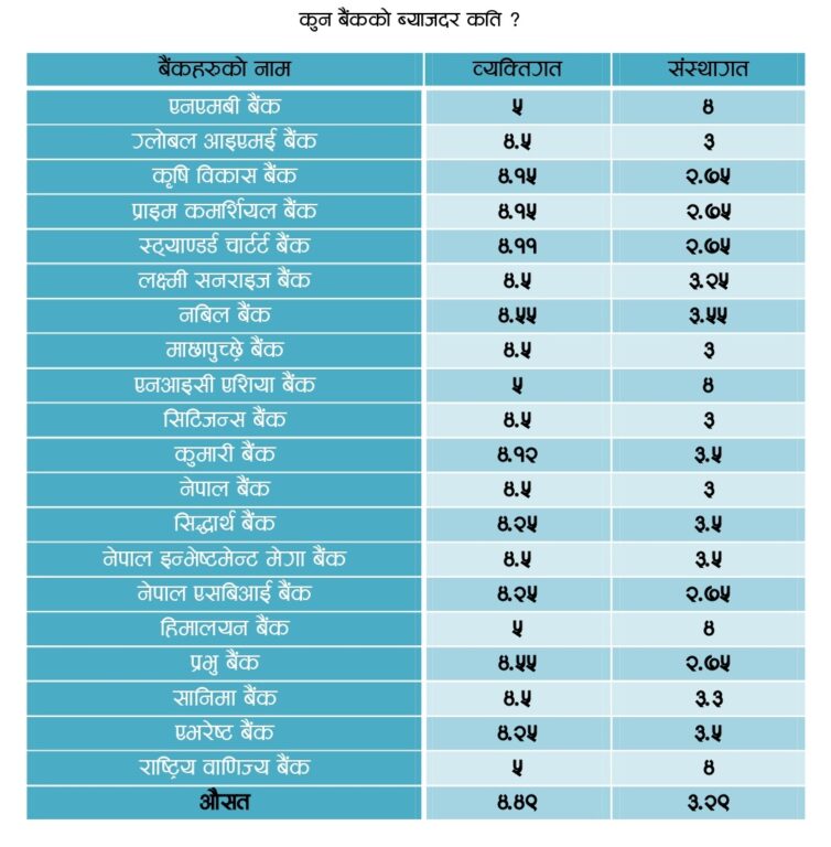 चैत महिनाका लागि बैंकहरुको ब्याजदर व्यक्तिगततर्फ ४.४९ प्रतिशत र संस्थागततर्फ ३.२९ प्रतिशत विन्दुमा झरेको छ । जबकि यस्तो ब्याजदर फागुन महिनामा व्यक्तिगतमा ४.५६ र संस्थागतमा ३.३३ प्रतिशत विन्दुमा थियो ।