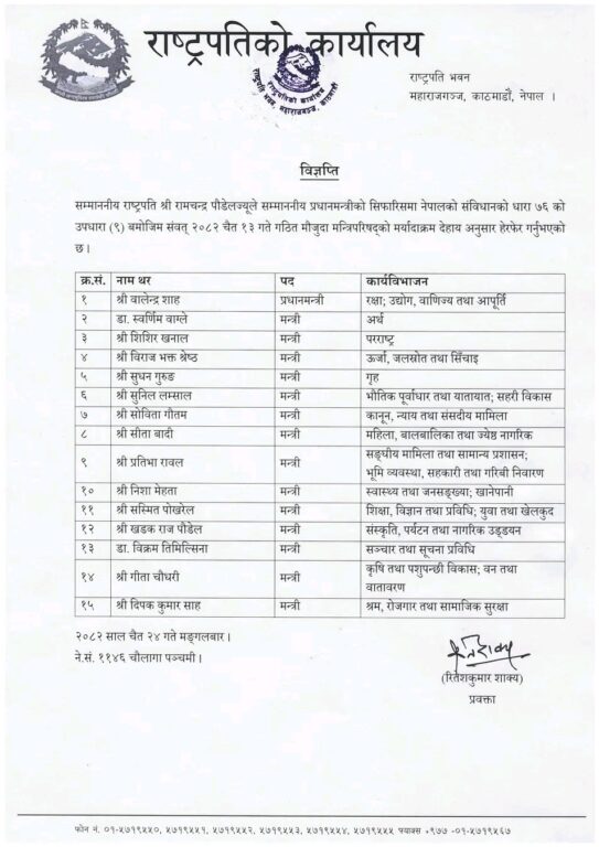 काठमाडौं । बालेन्द्र शाह नेतृत्वको मन्त्रिपरिषद्मा मन्त्रीहरूको वरीयता हेरफेर गरिएको छ । प्रधानमन्त्रीको सिफारिसमा राष्ट्रपति रामचन्द्र पौडेलले क्याविनेटको मर्यादाक्रम हेरफेर गरेका हुन् ।