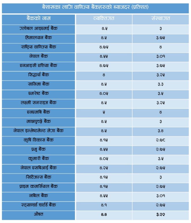 काठमाडौं । वैशाख महिनाका लागि वाणिज्य बैंकहरुले नयाँ ब्याजदर सार्वजनिक गरेका छन् । चैत्रको तुलनामा वाणिज्य बैंकहरुको औषत ब्याजदर घटेको ।