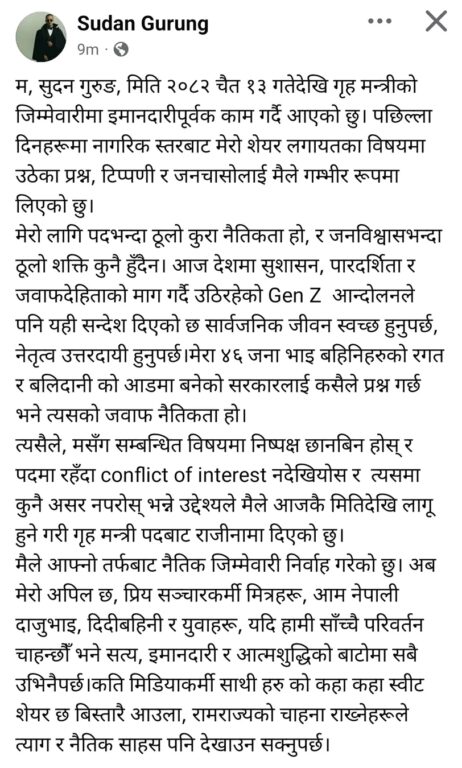 काठमाडौं । गृहमन्त्री सुधन गुरुङले राजीनामा दिएका छन् ।