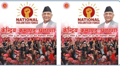 काठमाडौँ । नेकपा एमालेले आज नेसनल भोलेन्टियर फोर्सको घोषणा गर्ने भएको छ । आज बिहान