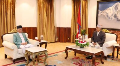 काठमाडौं । राष्ट्रपति रामचन्द्र पौडेलसँग प्रधानमन्त्री केपी शर्मा ओलीले भेटवार्ता गरेका छन । राष्ट्रपति भवन शीतल